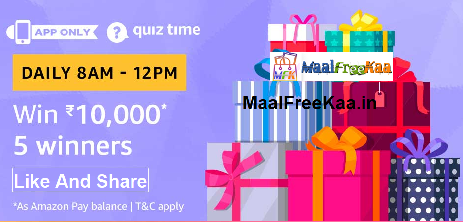 Amazon Today Quiz Answers for 25th March – Win Rs 500 Amazon App Rs 10000 Quiz Time Answer and win Rs 10000 if you answer all the quiz questions correctly, you will be entitled for a lucky draw which will be carried out amongst participants who have answered that particular question correctly. MaalFreeKaa.in No.1 Online Giveaway Website you can find all update about Online Contest, Free Stuff Deal, Free Sample, Cashback, Loot Deal Coupon and Freebie Deal. Now We Are High Ranked Web in Publish Insurance Car Insurance Article for reward. Valentine’s Day Contest Valentine’s Day Free Gift Valentine Gift Valentine’s Day Offer Only Here To Find All Contest Amazon app quiz time and Answer. The draw of lots will be carried out during the Contest Period for the questions and a total of 5 participants will be selected as winners by a random draw of lots. A total of 5 participants will be selected as winners of the Contest Win Rs 10000.
